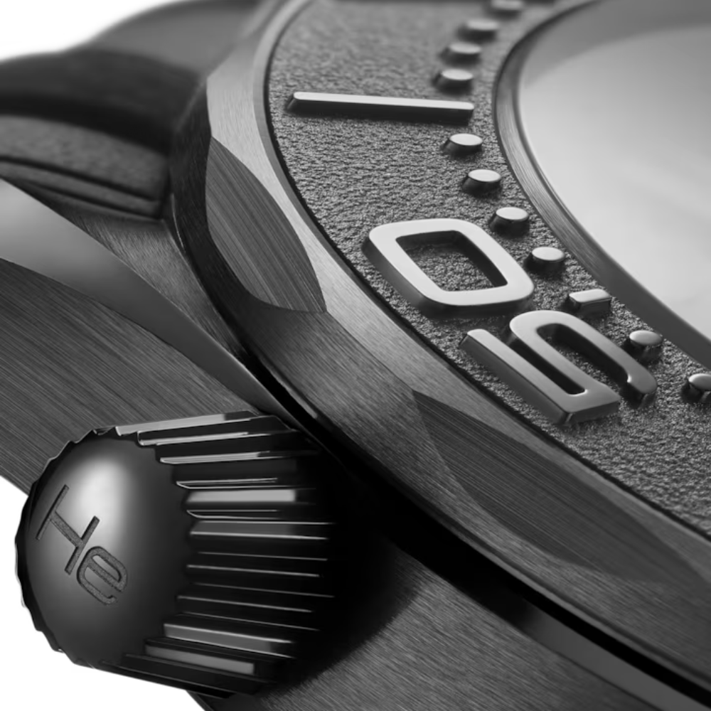 Every element of the watch is bathed in black — from the case and bezel, to the crown, dial, and even the helium escape valve. The iconic wave motif is laser-engraved on a matte ceramic dial, echoing the depths of the ocean while maintaining a sense of calm, calculated menace.