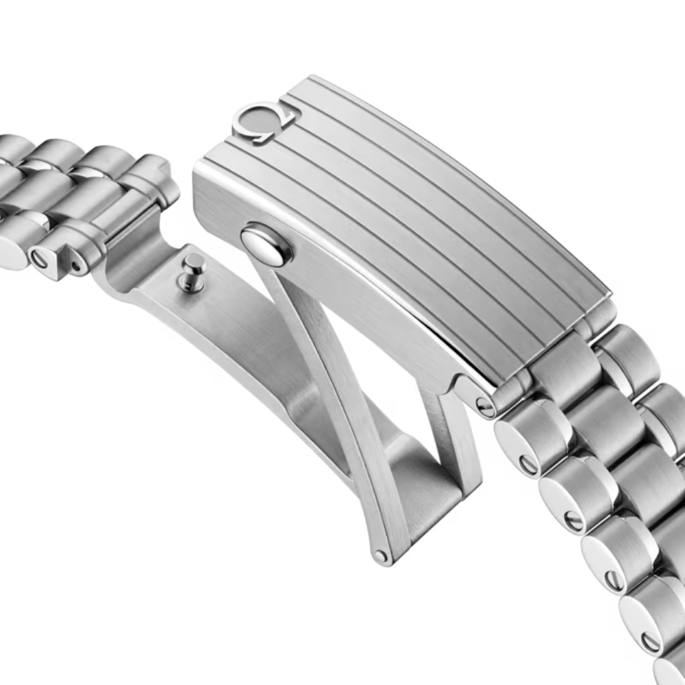 The stainless steel bracelet is more than an accessory — it’s a structural statement. With a comfort-focused design, beautifully brushed surfaces, and polished links, it secures the Moonwatch on your wrist with refined authority.